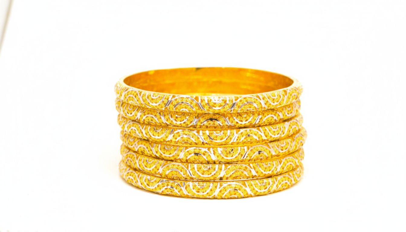 Traditional Gold Choori Set with intricate floral detailing and a polished shine. Lightweight, durable, and perfect for weddings or festive occasions.