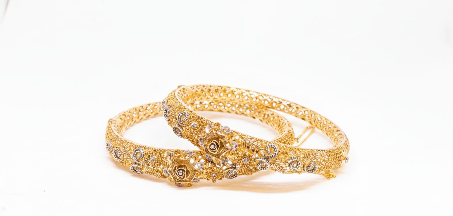 Traditional Gold Choori Set with intricate floral detailing and a polished shine. Lightweight, durable, and perfect for weddings or festive occasions.