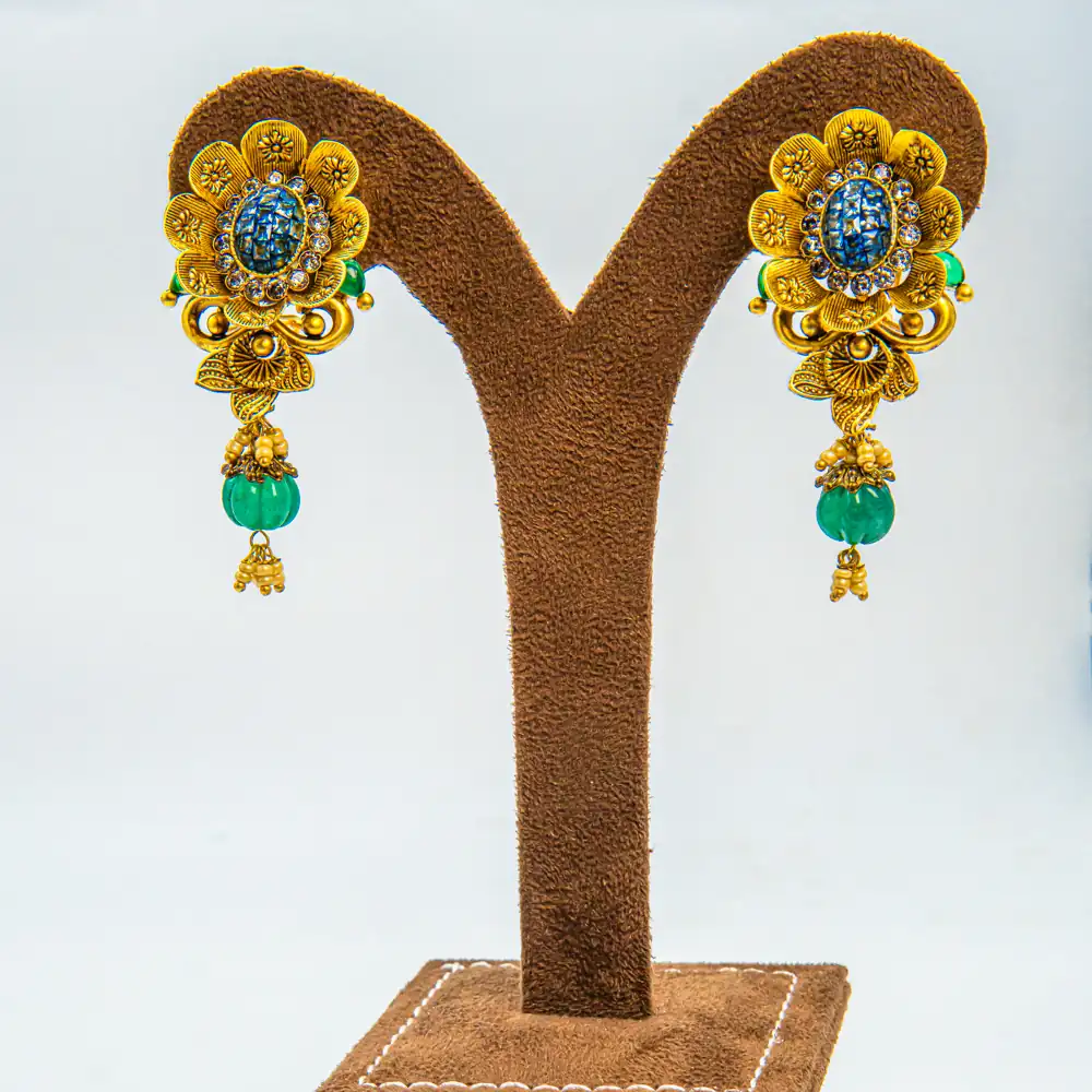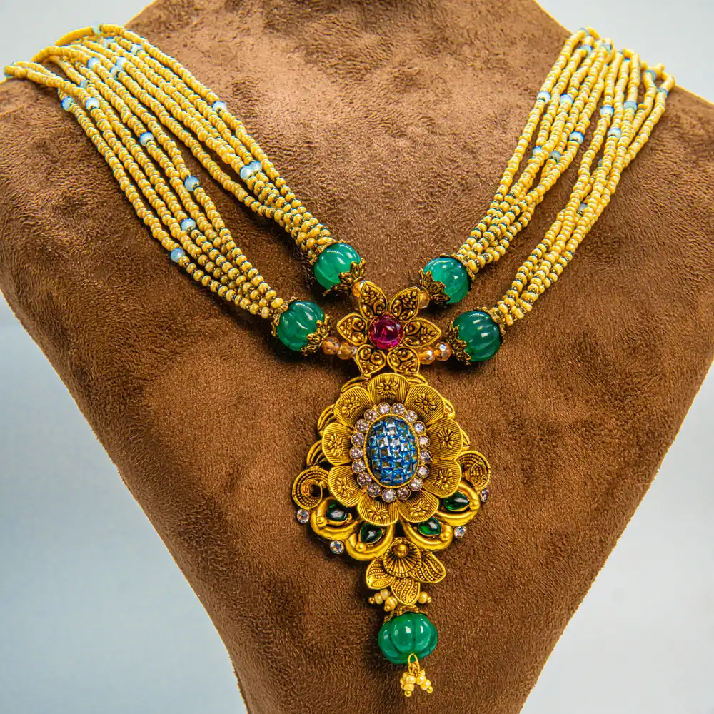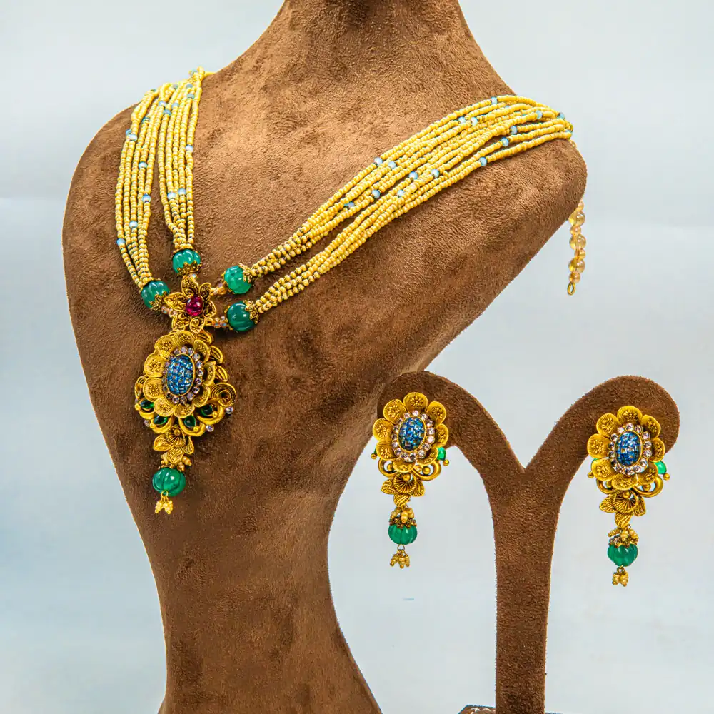 Design: Elegant handcrafted necklace set with matching earrings, combining traditional motifs and modern finesse