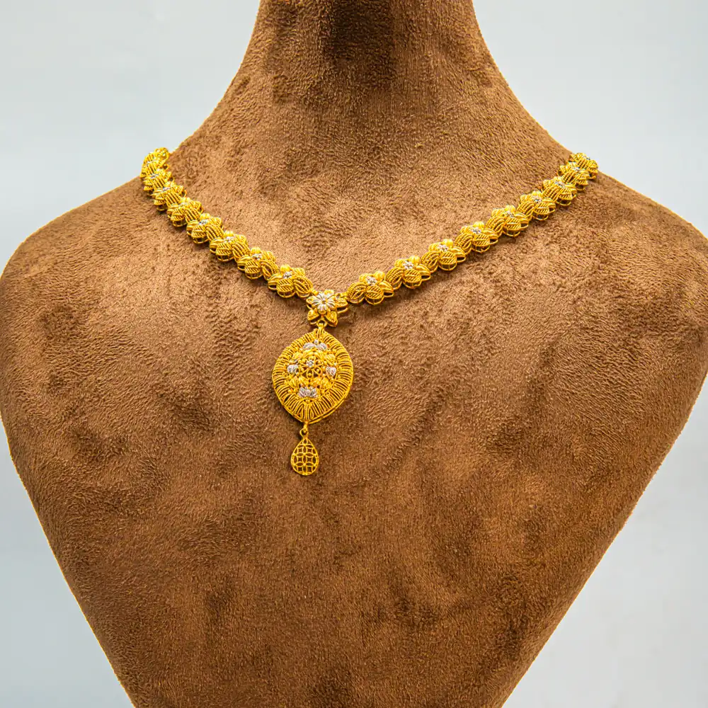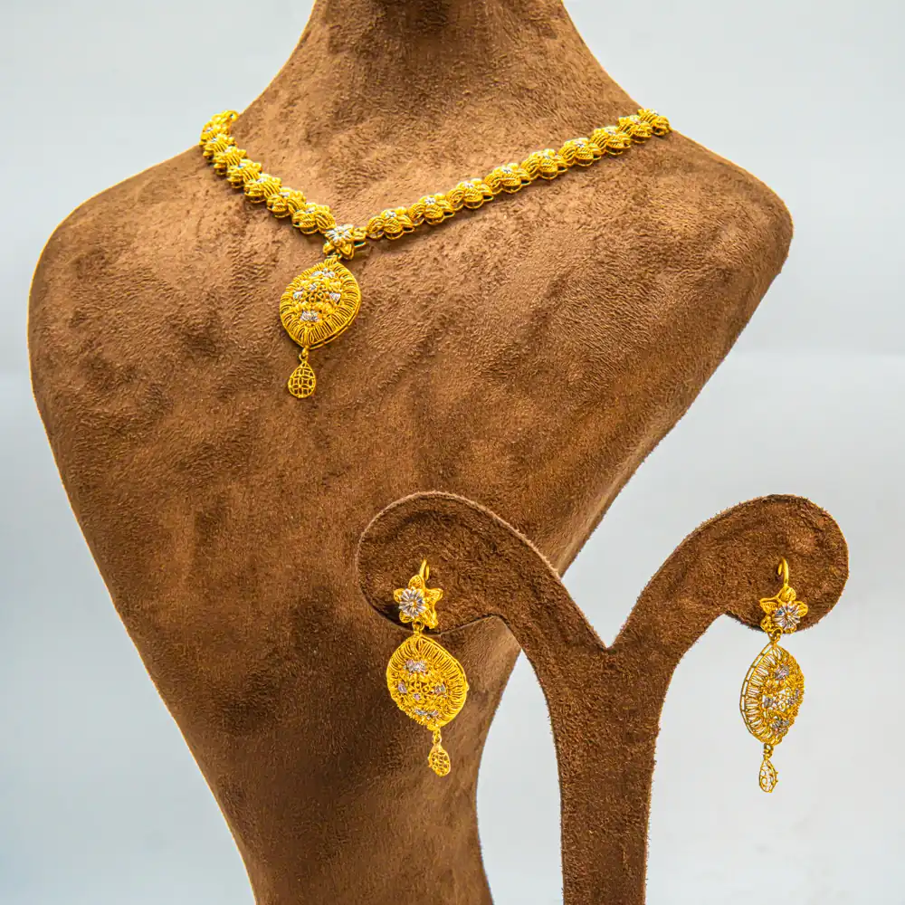 Celebrate timeless beauty with this exquisite 21K gold necklace set from Gehnay Jewellers—designed to elevate your look with unmatched grace and brilliance.