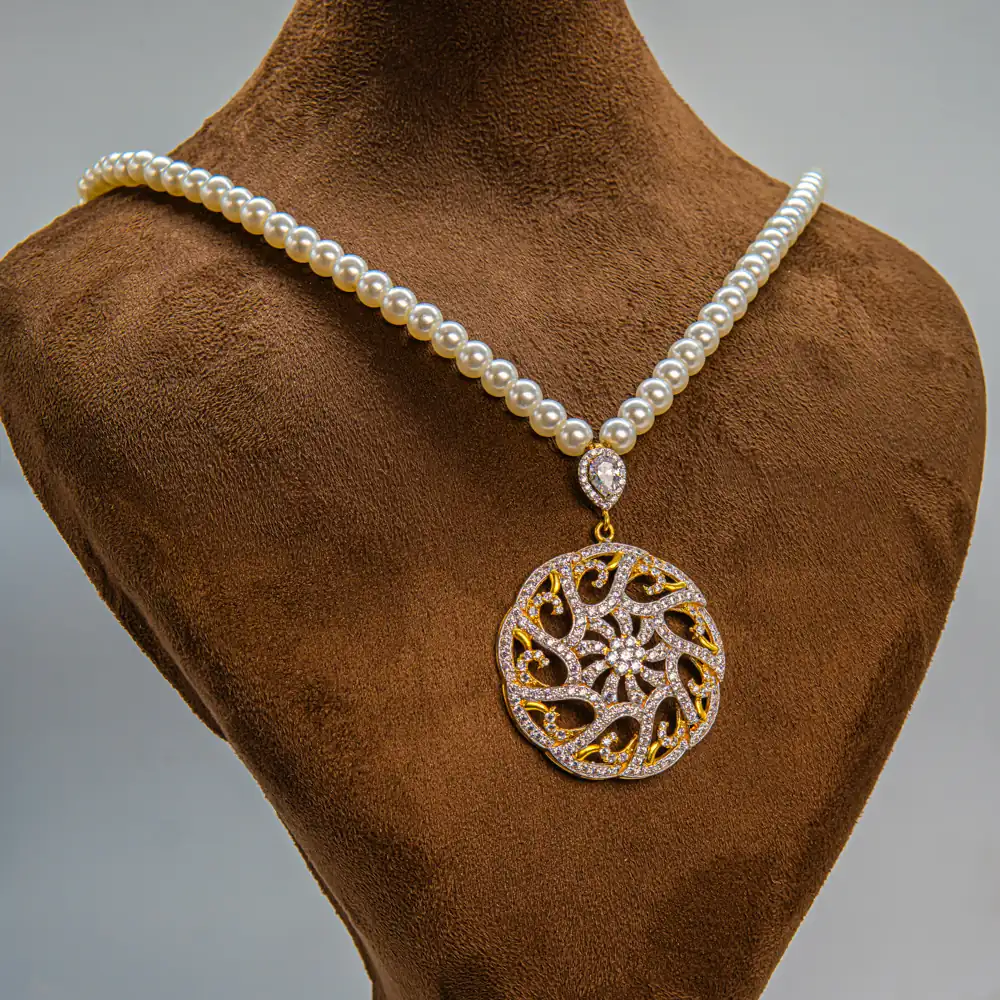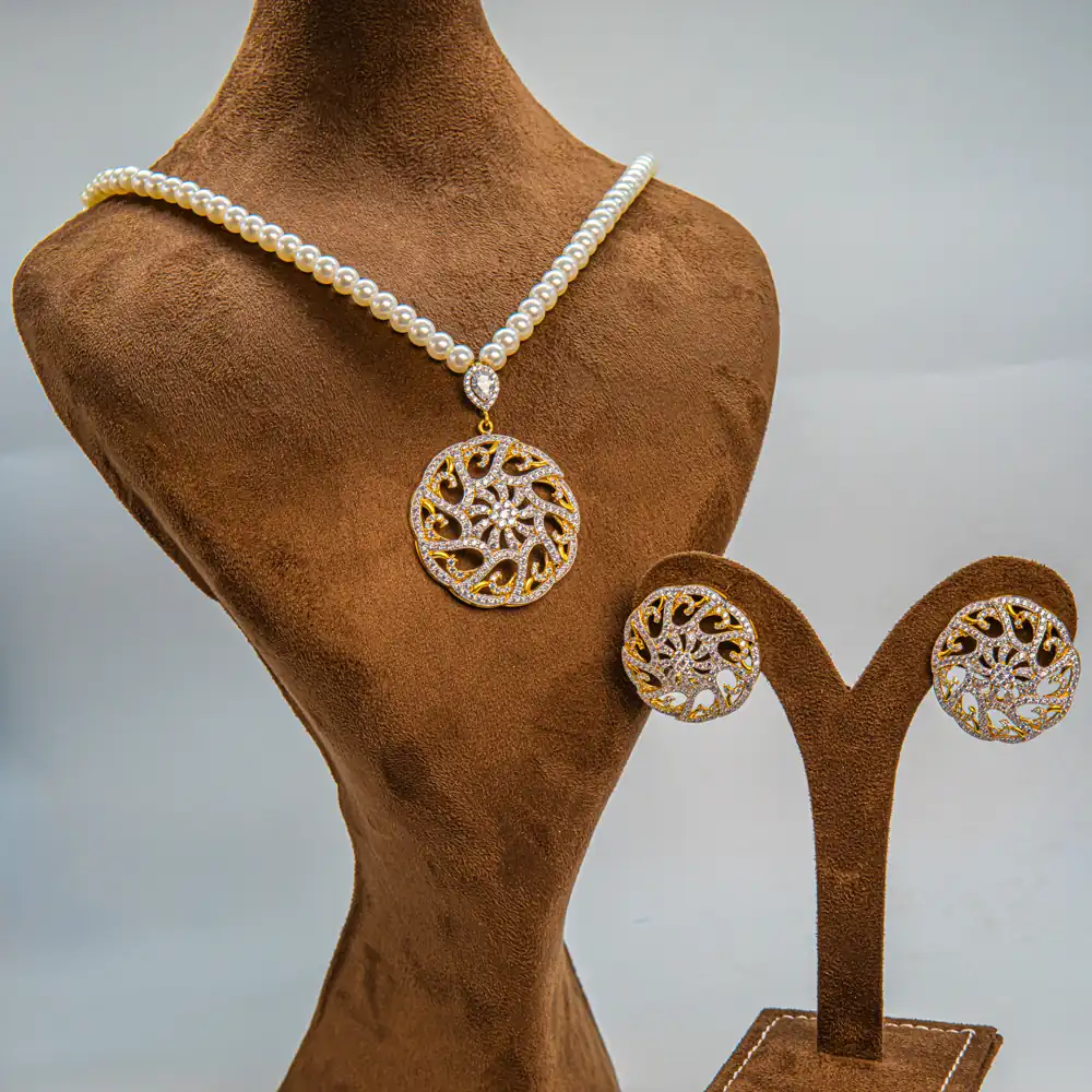 Design: Elegant handcrafted necklace set with matching earrings, combining traditional motifs and modern finesse