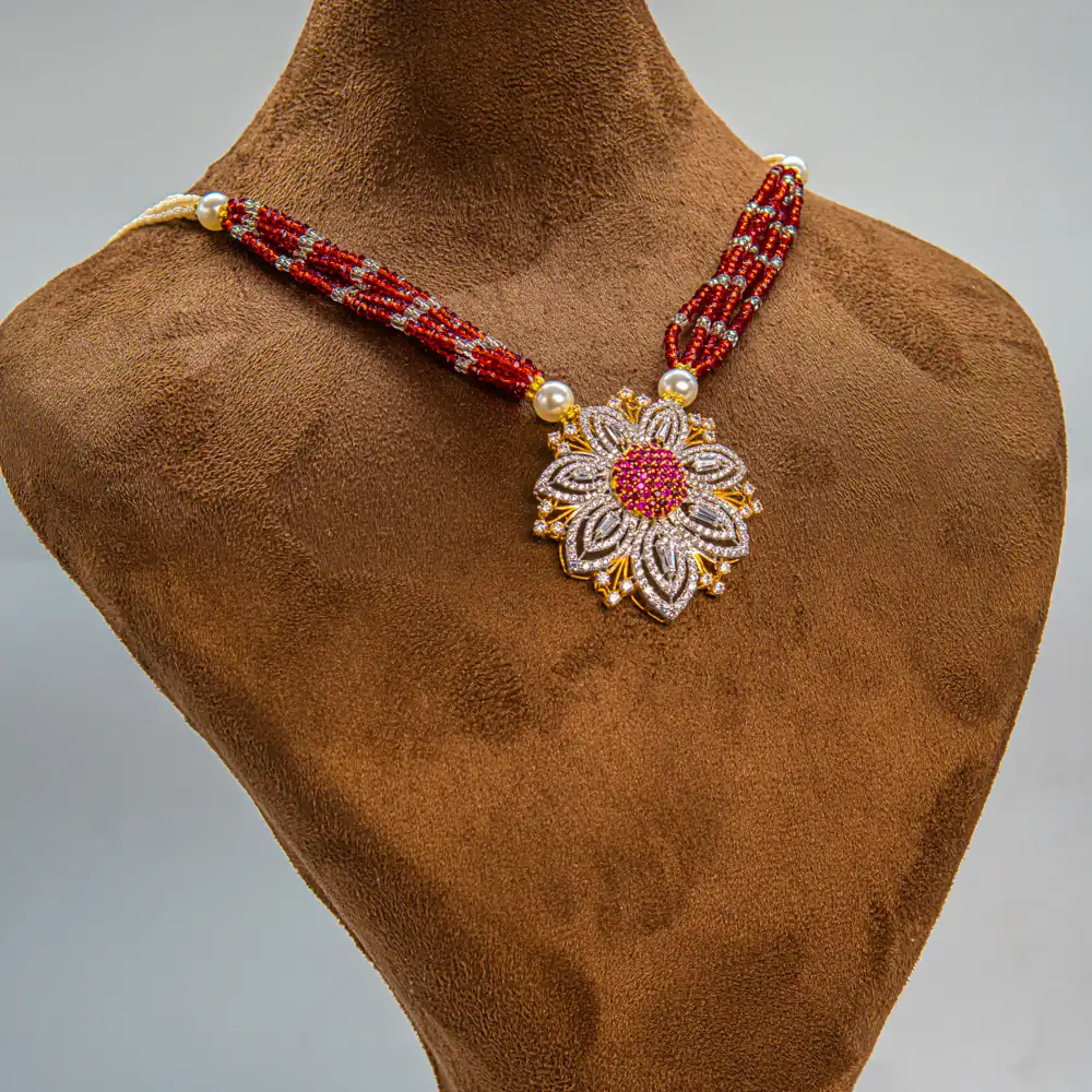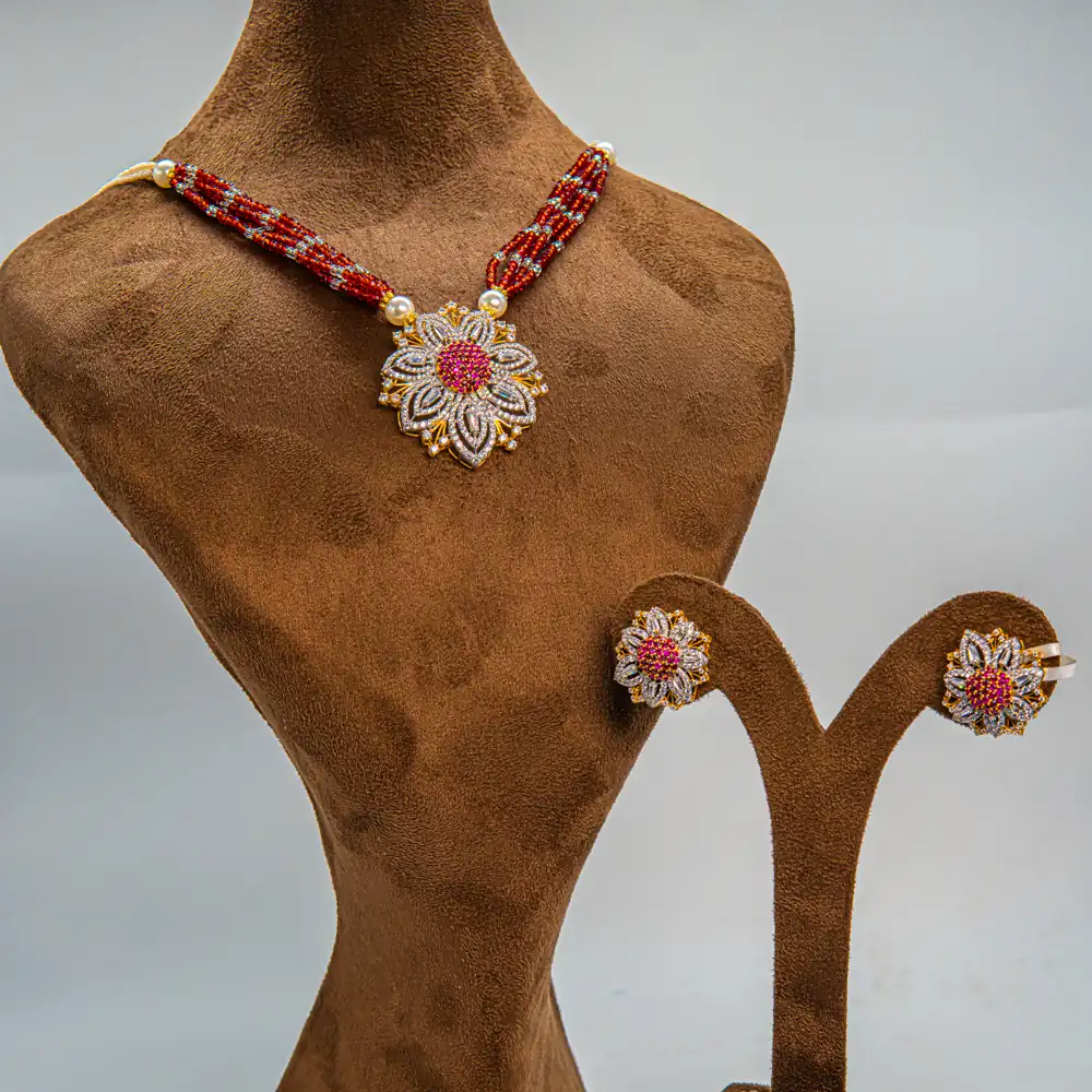 Design: Elegant handcrafted necklace set with matching earrings, combining traditional motifs and modern finesse