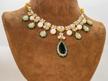 Design: Elegant handcrafted necklace set with matching earrings, combining traditional motifs and modern finesse